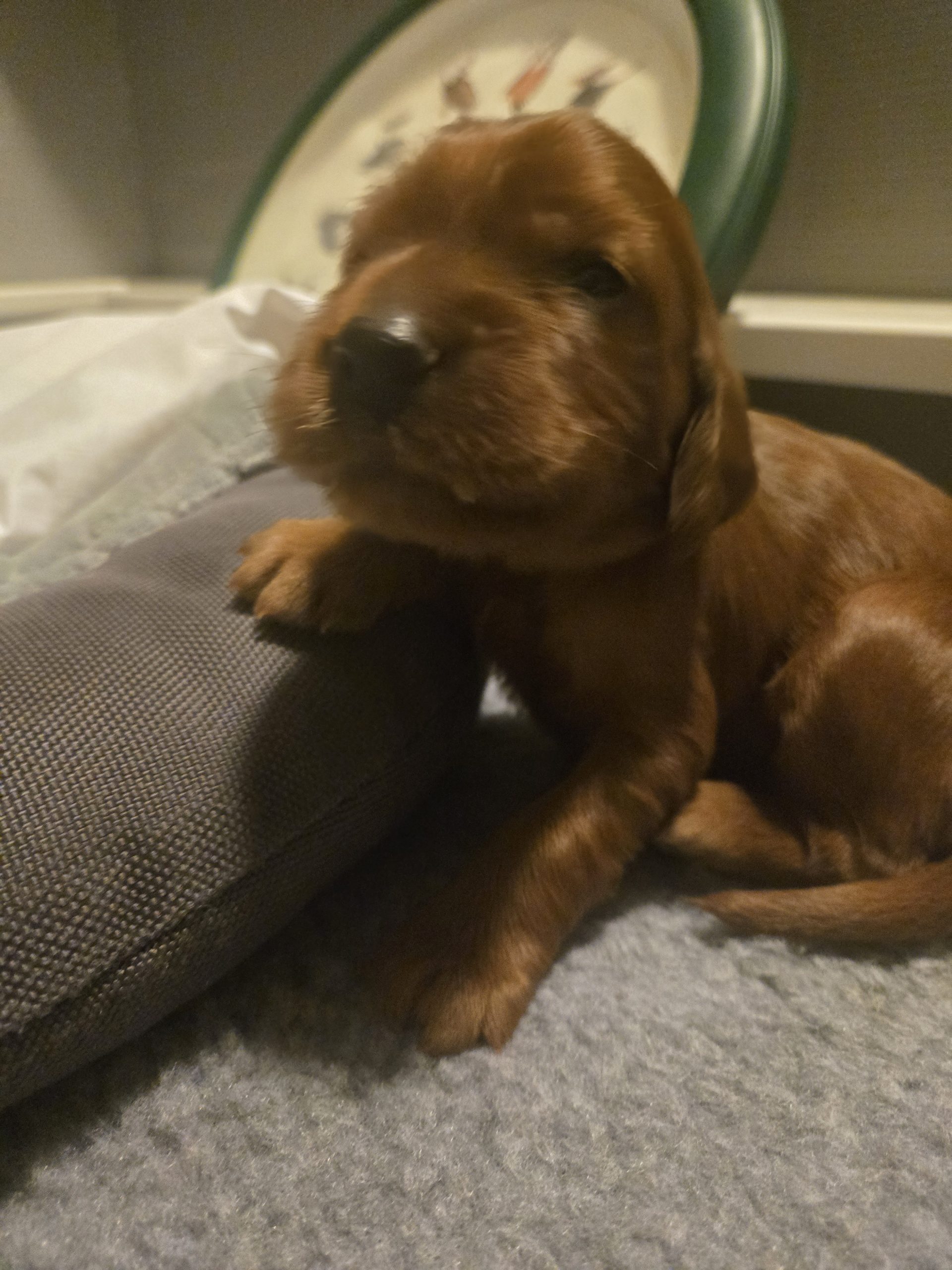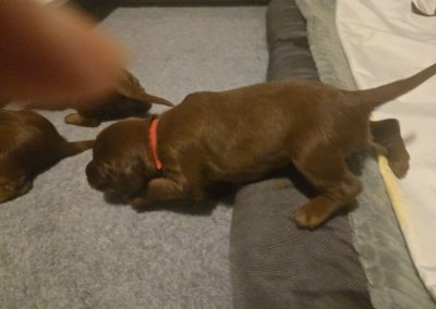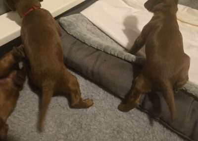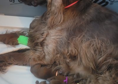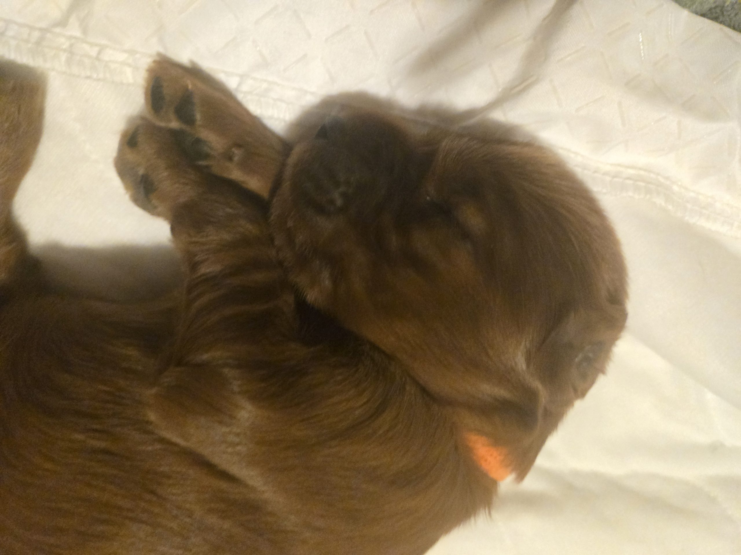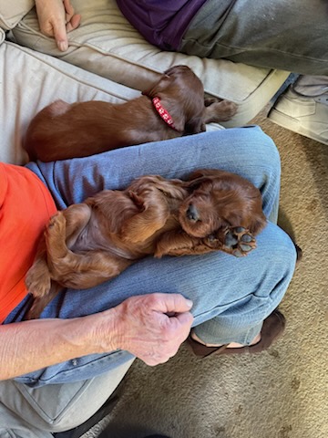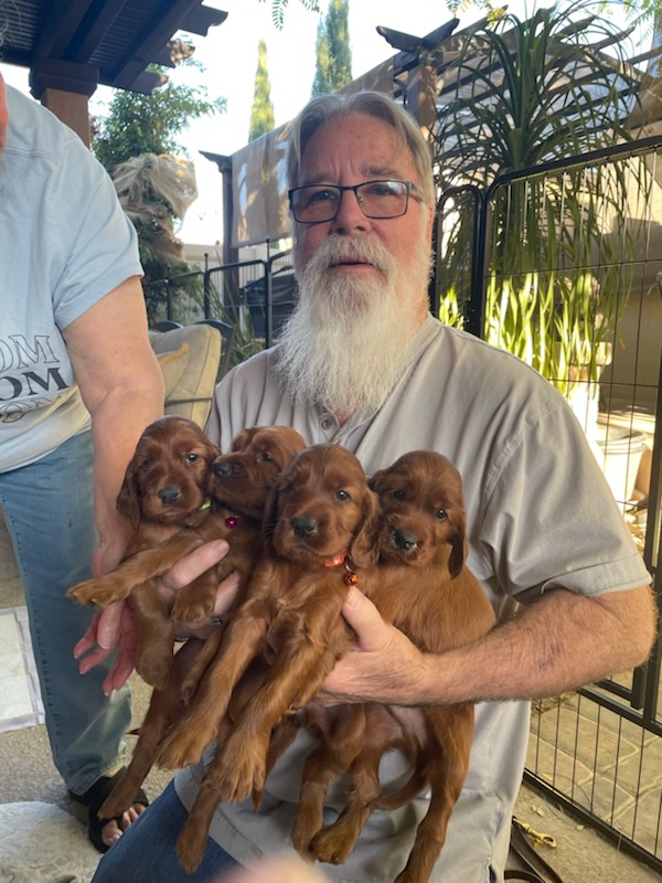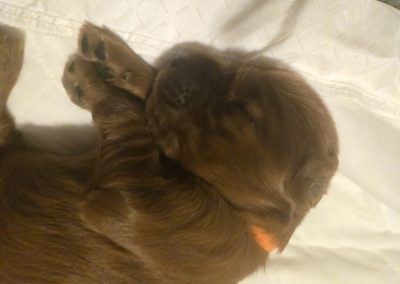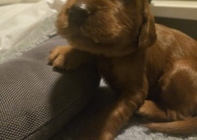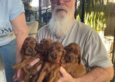 At Dearg na hEireann we follow Kerry Nichol Puppy Brain Training guide. We start at 3 days old with touch and handling. After 3 weeks of quarantine, pups are exposed to a multitude of sights, sounds, textures and smells. At 6 weeks commands and potty training are introduced along with socialization with outside individuals and other healthy dogs. All our puppies are health checked by veterinarian and all appropriate shots are given.