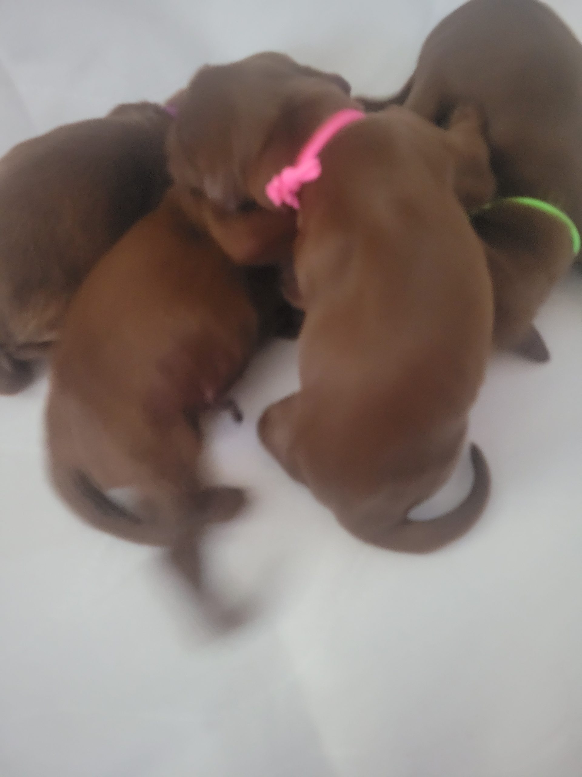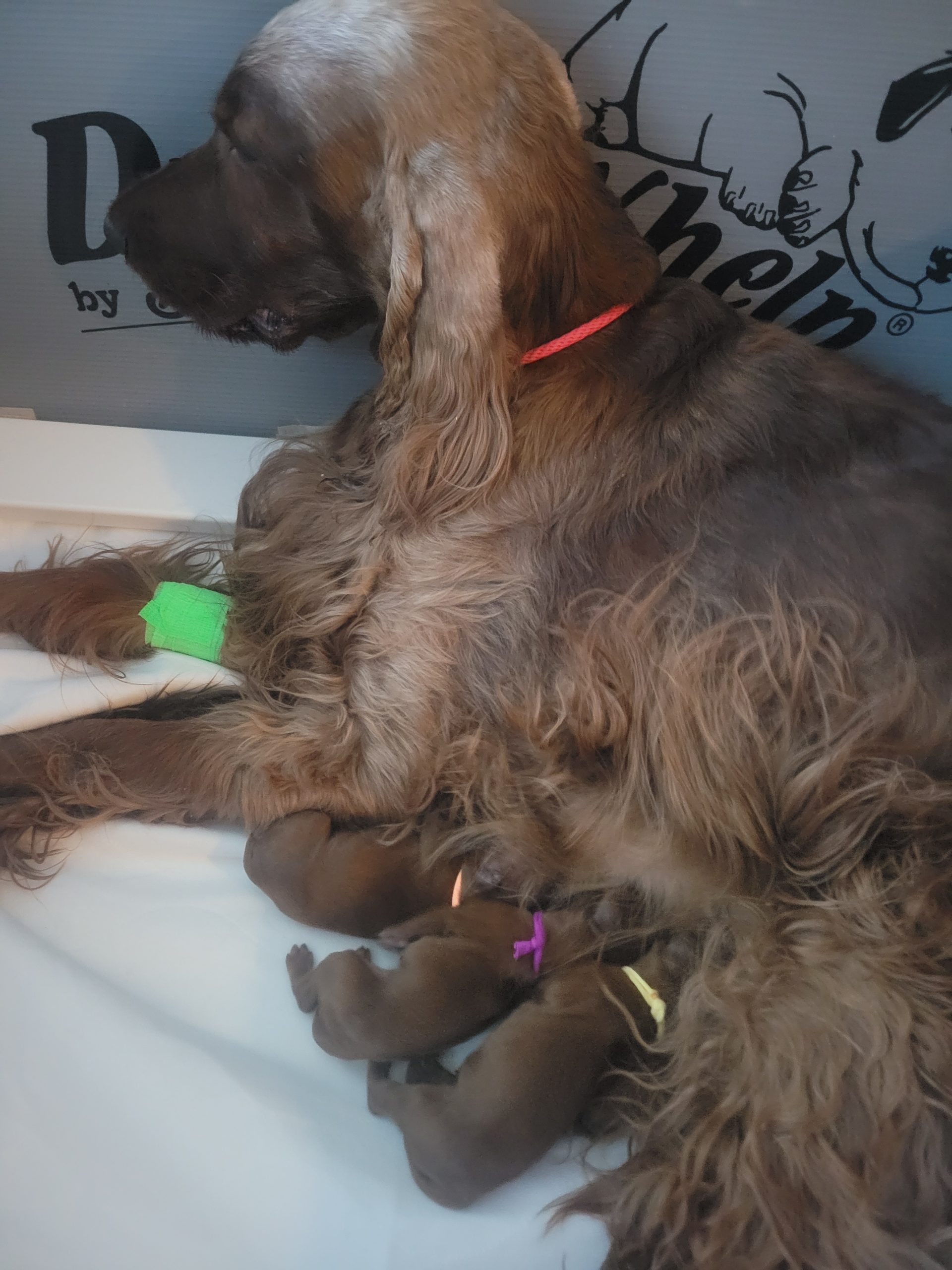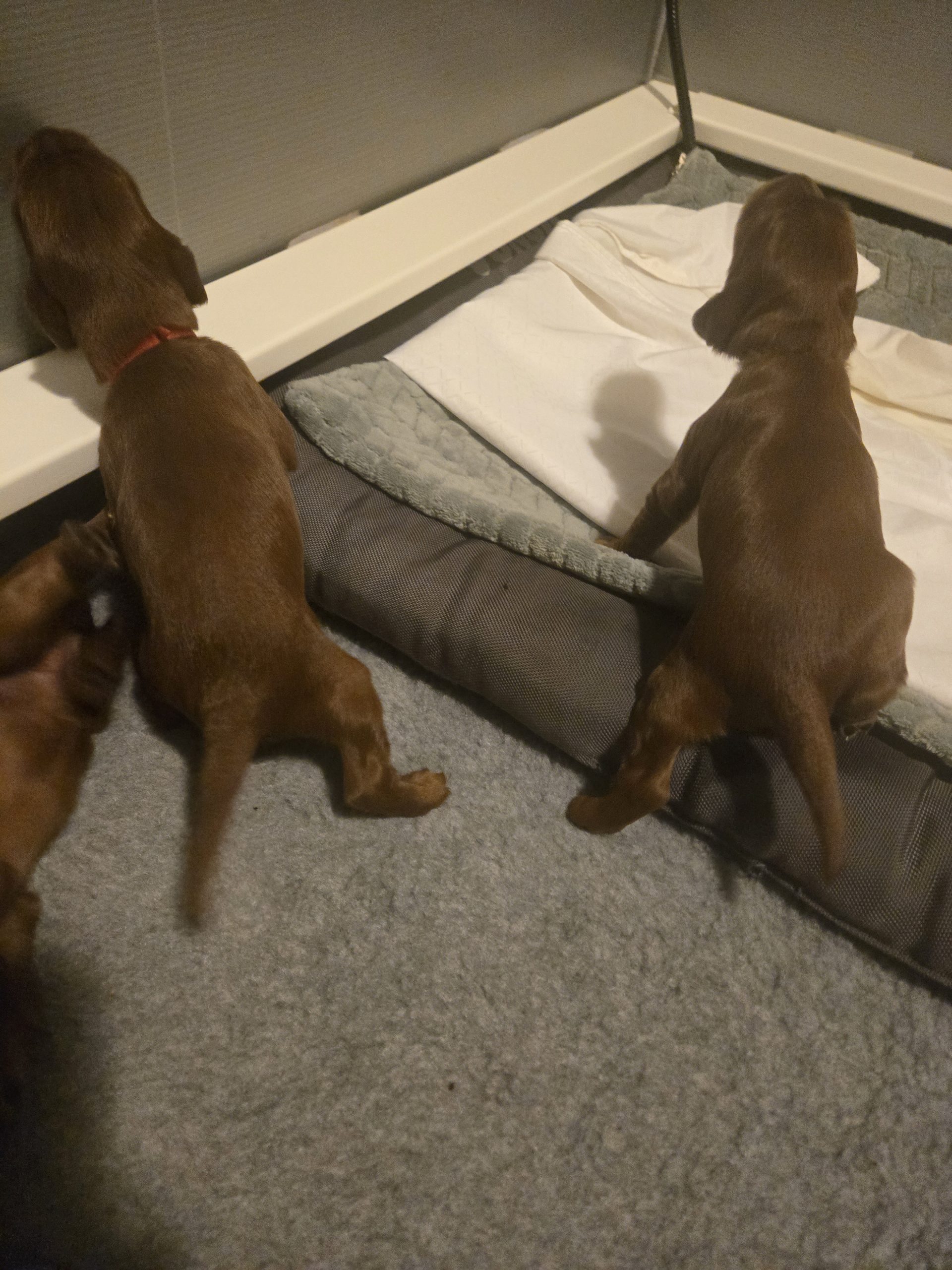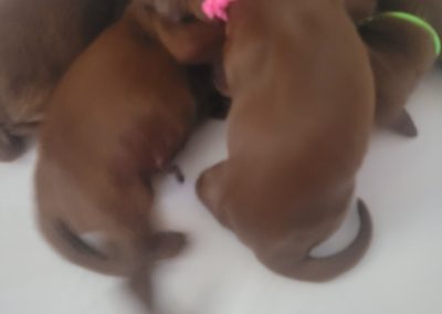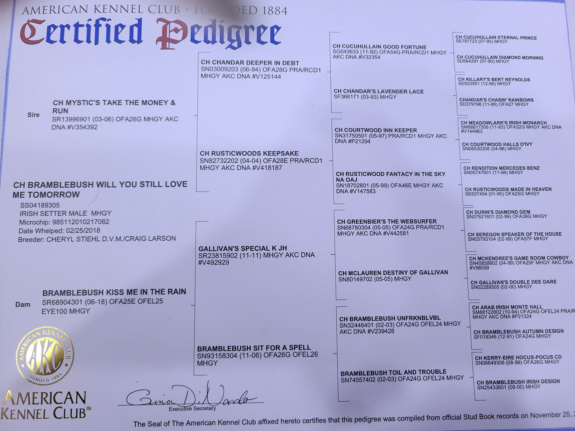 At Dearg na hEireann we follow Kerry Nichol Puppy Brain Training guide. We start at 3 days old with touch and handling. After 3 weeks of quarantine, pups are exposed to a multitude of sights, sounds, textures and smells. At 6 weeks commands and potty training are introduced along with socialization with outside individuals and other healthy dogs. All our puppies are health checked by veterinarian and all appropriate shots are given.