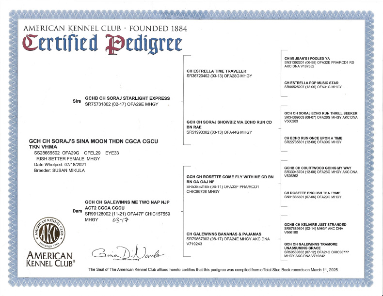 All Irish Setters from this breeder receive age-appropriate vaccinations, shots, deworming, and health testing. This includes testing for hips, eyes, thyroid, and heart, with results submitted to the OFA (Orthopedic Foundation for Animals).
